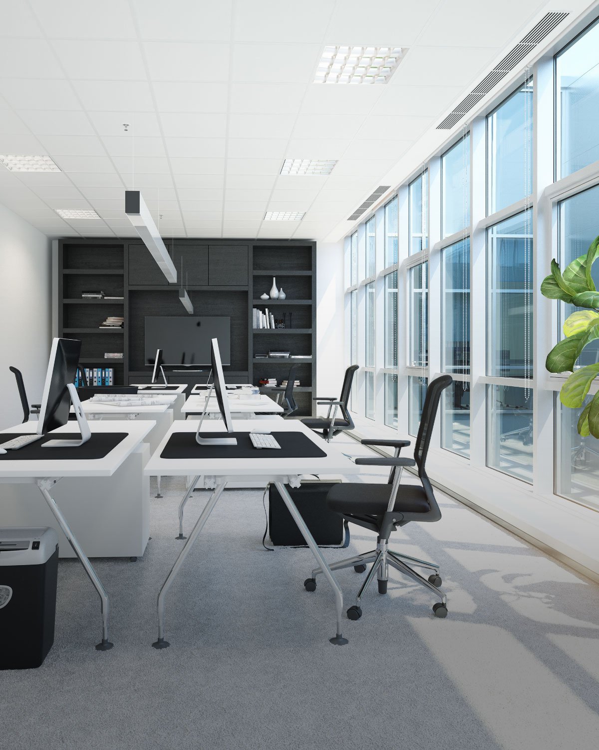 开放式办公空间分为完全开放和半开放两种形式。完全开放的办公空间没有隔断,可以看到房间的每一个角落;而半开放的办公空间则通过不同的分区来划分不同的部门。由于开放式办公空间没有隔断,噪音污染是一个必须重视的问题。在照明设计时,每一处的照明必须均匀,不能产生眩光。此外,还需要重视机电、空调、强弱电系统的设计,以确保办公功能和工作效率。